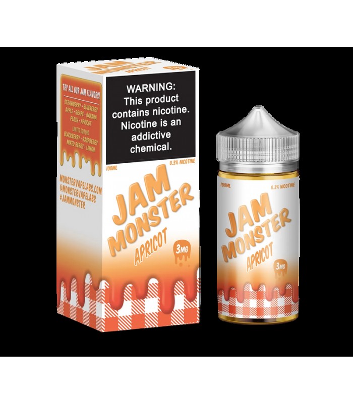 Apricot 100ml - Jam MonsterApricot: A rich, succulent, fruity apricot marmalade with a sweet candied finish.Flavor Profile: ApricotNicotine Level: 0mg, 3mg, 6mgBottle Size: 100ml Quick Links:All Jam Monster E-LiquidsAll Regular E-Liquids..
