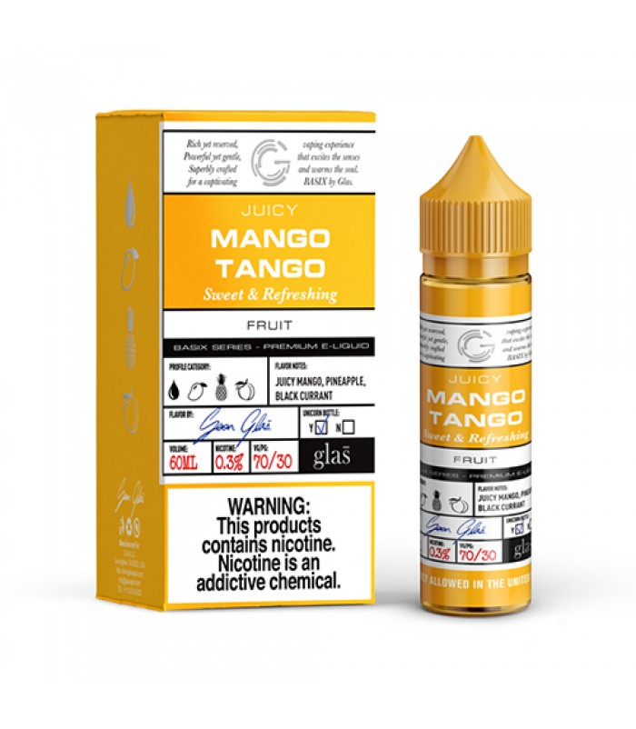 Mango Tango: The sultry taste exotic mango fruit blended together with tropical pineapple and ripe black currant. Let your senses be washed away in a fog of tropical goodness with this fantastic Ejuice. For a taste of tropical paradise, try Mango Tango from Glas Basix today!