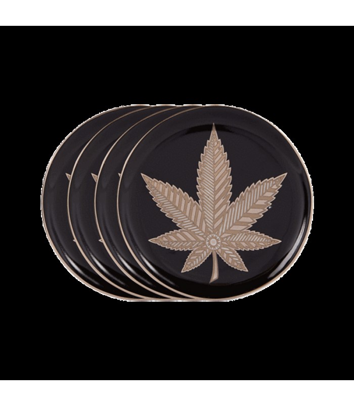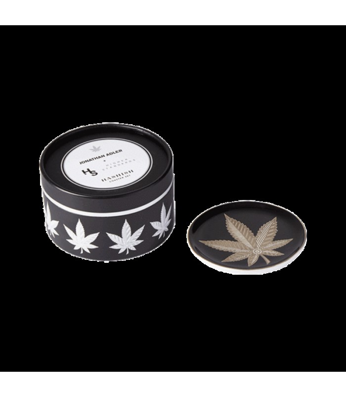 The Higher Standards x Jonathan Adler Hashish Coasters deliver a stylish and accommodating addition to your tablescape. This 4-piece set is crafted from high-fired porcelain, delivering peace of mind by protecting against water rings and burns. The heat-resistant Hashish Coasters boast 4-inch diameters that provide the perfect surface area for most drinkware—in addition to extremely hot tools and materials.Each Hashish Coaster is lacquered with a glazed black enamel, and carefully etched with a textured platinum leaf motif. The packaging is designed for easy-gifting and features the Higher Standards x Jonathan Adler signature color scheme, as well as a platinum leaf pattern. The Hashish Coasters are hand wash only; to clean, thoroughly dust with a soft, dry cloth.