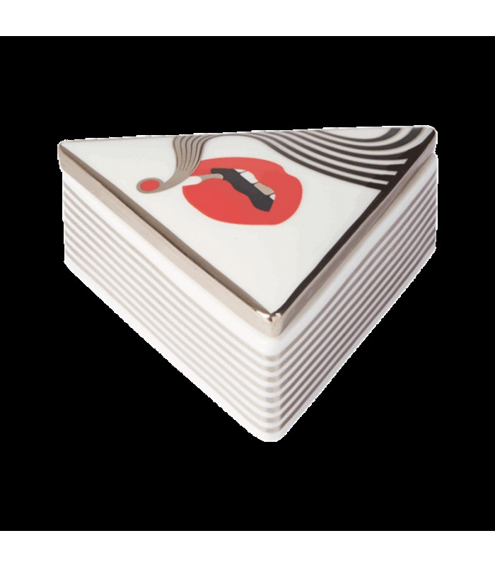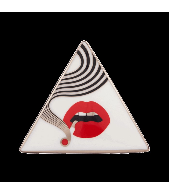 The Higher Standards x Jonathan Adler Smolder Triangle Box flirts with both design and discretion. Boasting a 4.5-inch diameter and 1.5-inch height, this handmade box’s high-fired porcelain protects and stealthily stores your smoking accessories and everyday items. The Smolder Triangle Box is crafted with raised inner edges that make ashing a quick and mess-free experience.The box’s white base features captivating black and platinum lines that run along its soft-edged triangular build. The removable lid’s smoking red lips and mind-bending cloud design invite you into a storage compartment that’s capable of holding smoking materials and everyday items. For your convenience, the lid can also be flipped over and used as a spare tray.