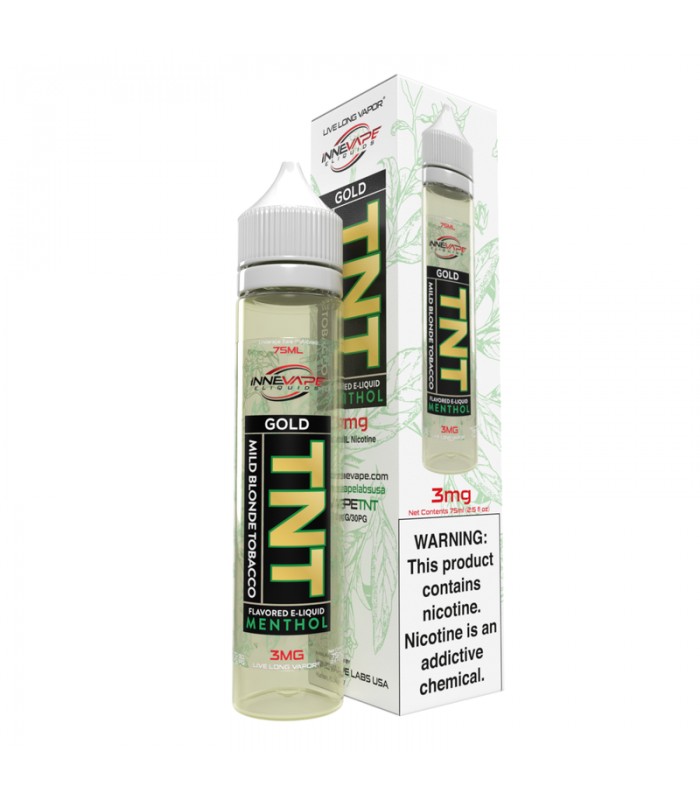 TNT Gold Menthol: This delicious tobacco & menthol e-juice is a smoother version of the signature TNT flavor. It features a mellow, blonde tobacco blended with subtle notes of real maple, fresh honey, and icy menthol to deliver a satisfying vaping experience. TNT Gold Menthol by Innevape.