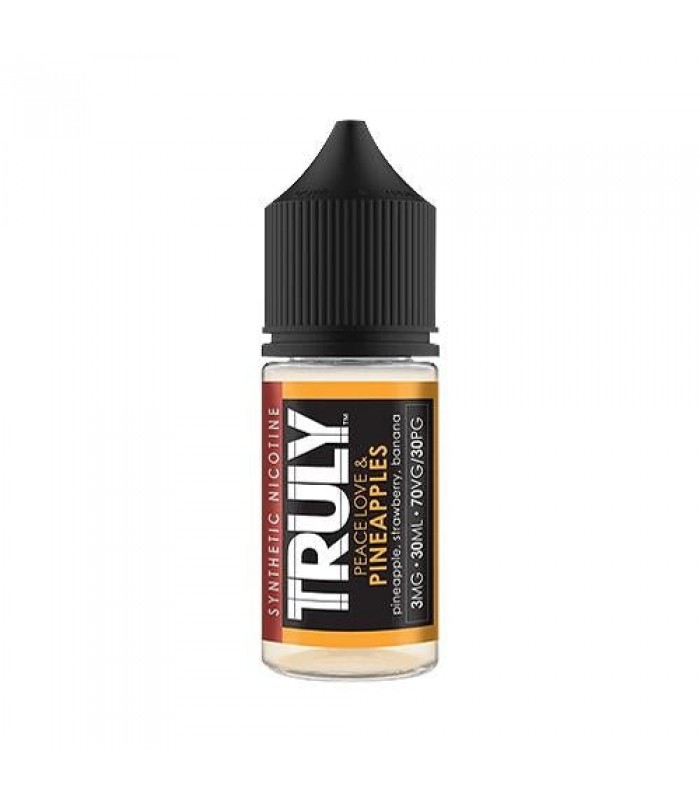 Truly Peace Love & Pineapples 30ml Vape JuicePeace Love & Pineapples: A tropical take on a classic smoothie. Strawberries, bananas, and pineapple blended to perfection.Flavor Profile: Strawberry, Banana, PineappleVG/PG: 70/30Nicotine Level: 3MG, 6MGB..