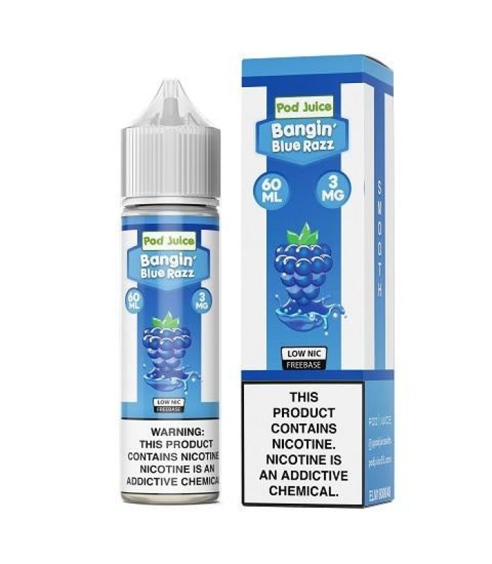 Pod Juice Bangin Blue Razz 60ml Vape JuiceBangin' Blue Razz: Tart and tangy blue raspberry candy flavor blended with a sweetened menthol layer.Flavor Profile: Blue Raspberry, MentholNicotine Level: 0MG, 3MG, 6MGBottle Size: 60ml Quick Links:All Regul..