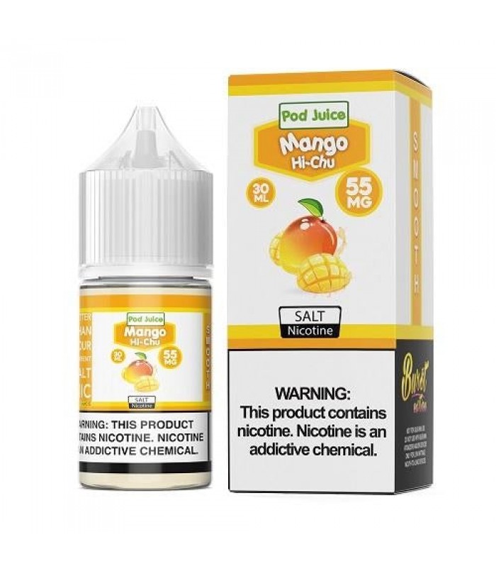 Pod Juice Mango Hi-Chu 30ml Nic Salt Vape JuiceMango Hi-Chu: Mango-flavored chewy taffy candy.Flavor Profile: Mango TaffyNicotine Level: 35MG, 55MGBottle Size: 30ml Quick Links:All Nicotine SaltsAll 30ml Nic Salts..