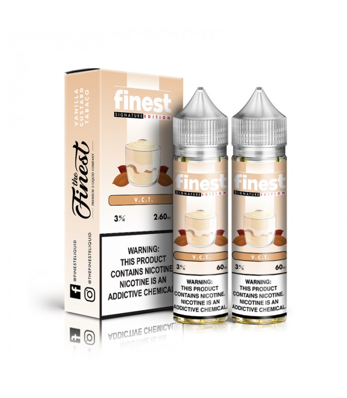 The Finest V.C.T. 2x 60ml Vape JuiceV.C.T.: Vanilla custard tobacco. Soft and sweet vanilla cream balancing a mild tobacco flavor.Flavor Profile: Vanilla Custard, Mild TobaccoNicotine Level: 0MG, 3MG, 6MGBottle Size: 2 x 60ml Quick Links:All E-Liquid..