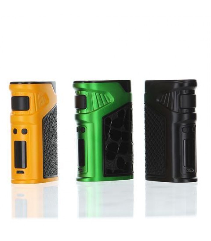 The Uwell Ironfist 200W comes in a variety of colors, with different leather grip textures depending on the color. The red, green and white mods feature a crocodile skin texture. The blue, black and purple mods feature a snakeskin texture, while the yellow and orange mods have a pearl grip texture.