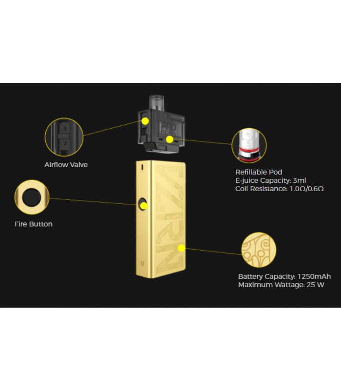 The Uwell Valyrian Pod System breaks boundaries by featuring an integrated 1250mAh battery, a 25W max wattage output, and can hold up to 3mL of both e-liquid and nic sald. The Valyrian is powered by 0.3ohm and 1.0ohm mesh coils and offers a dual firi..