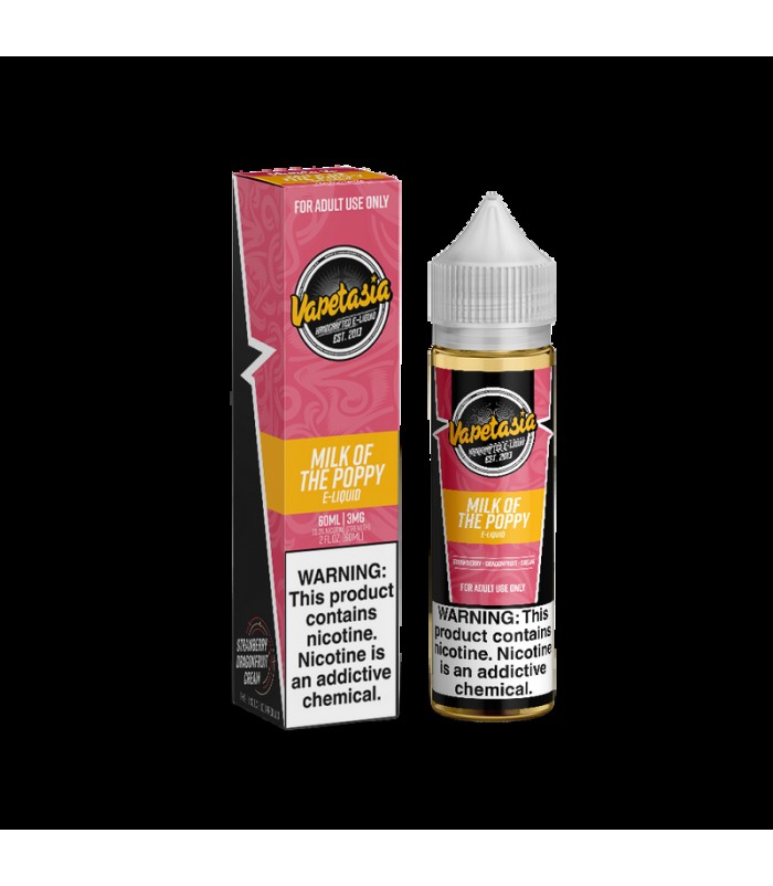 Milk of the Poppy: Treat yourself to sweet strawberry, ripe dragon fruit, and fluffy cream. These are mixed to savory perfection. It is smooth and satisfying. Don't miss out! Milk of the Poppy by Vapetasia.Flavor Profile: Strawberry, Dragon Fruit, Cr..