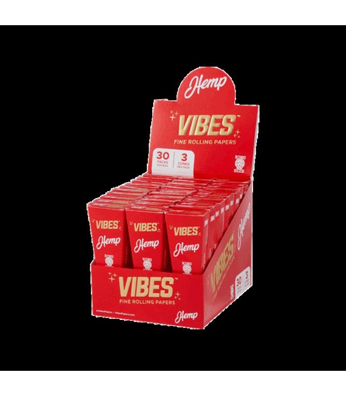 Always be prepared for your next session with the Vibes Cones Box - King Size. King size cones can hold around 1 gram of material. Each box contains 30 coffins of King Size Vibes Cones with 3 cones in each box, giving you 90 King Size Vibes Cones. Th..